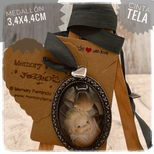 Medallón "Virgen beso", base y corazón plateada, cristal lupa 3,4x4,4 cm, cinta ancha tela