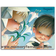 Tarjeta Comunión Ferrándiz NIÑOS CON LIRIOS+ sobre plateado, 15 x 19 cm